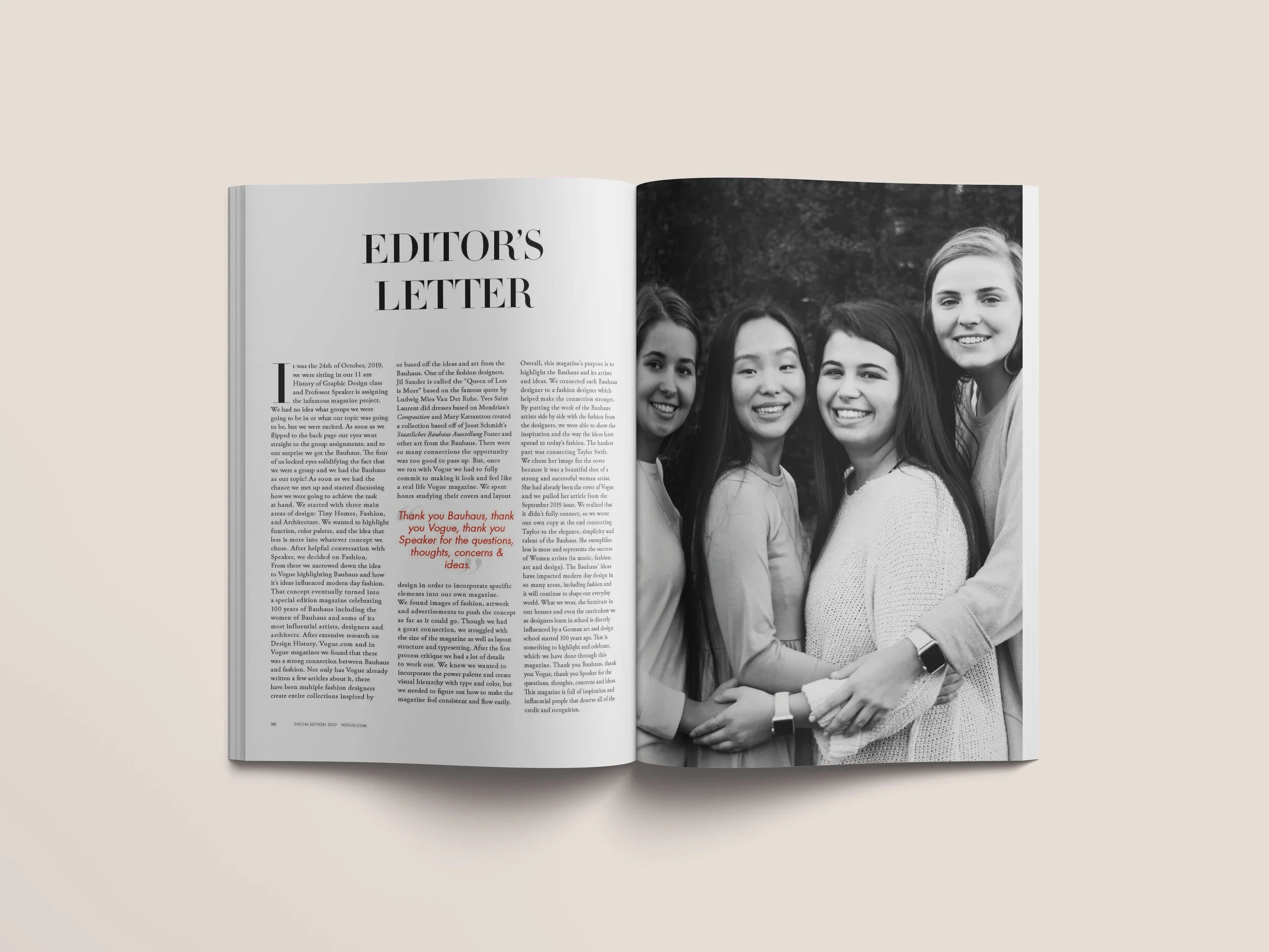 Design cover layout and masthead, spreads for Anni Albers and Women of Bauhaus features, assist with fashion spreads and write the editors letter.